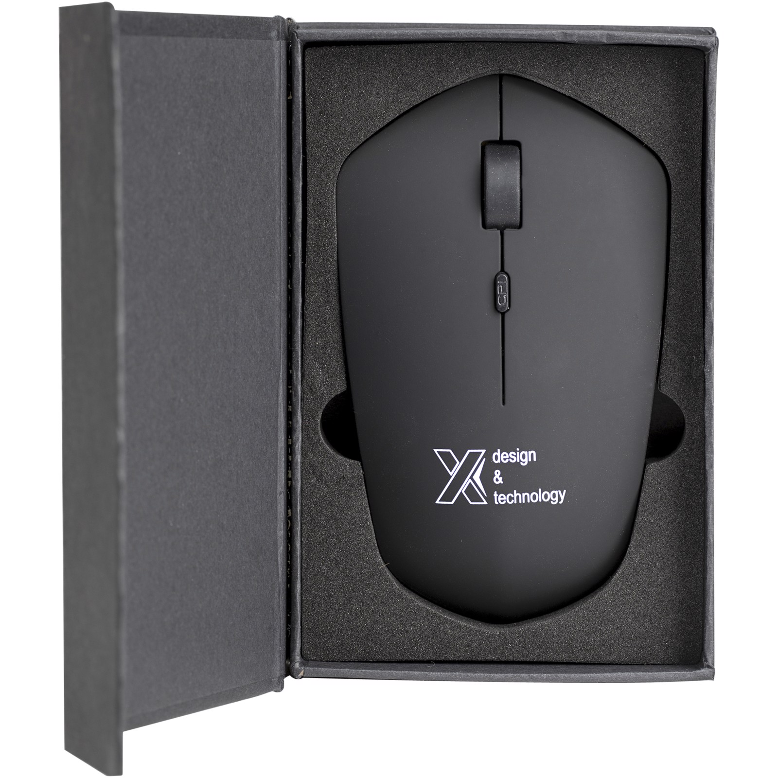 Rechargeable light-up logo wireless mouse with antibacterial treatment. The light-up logo brights when fully charged, and darkens when 20% of the battery remains. USB input/output: 5V - 0.035 A. Capacity: 400 mAh. DPI: 800/1200/1600. Charging time: 3 hours. 1 metre USB cable included. Delivered with a gift box with magnetic closure, made out of recycled paper.