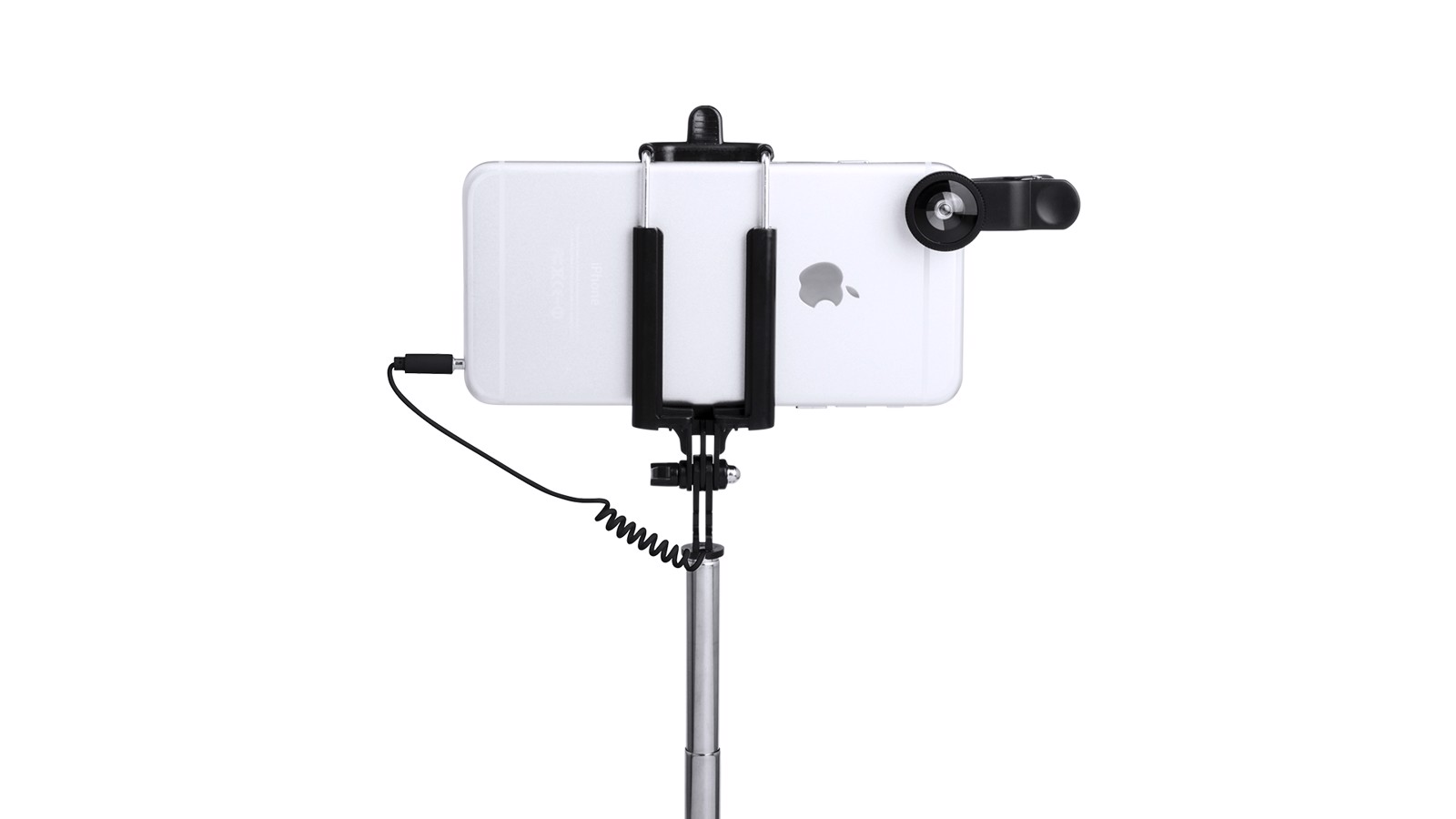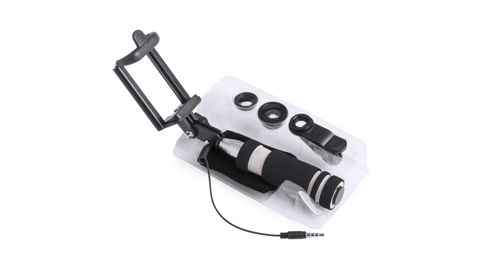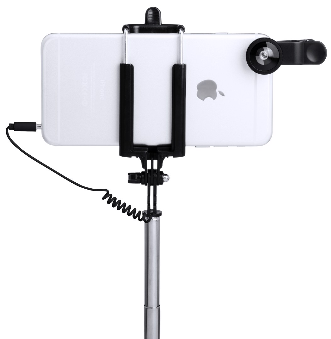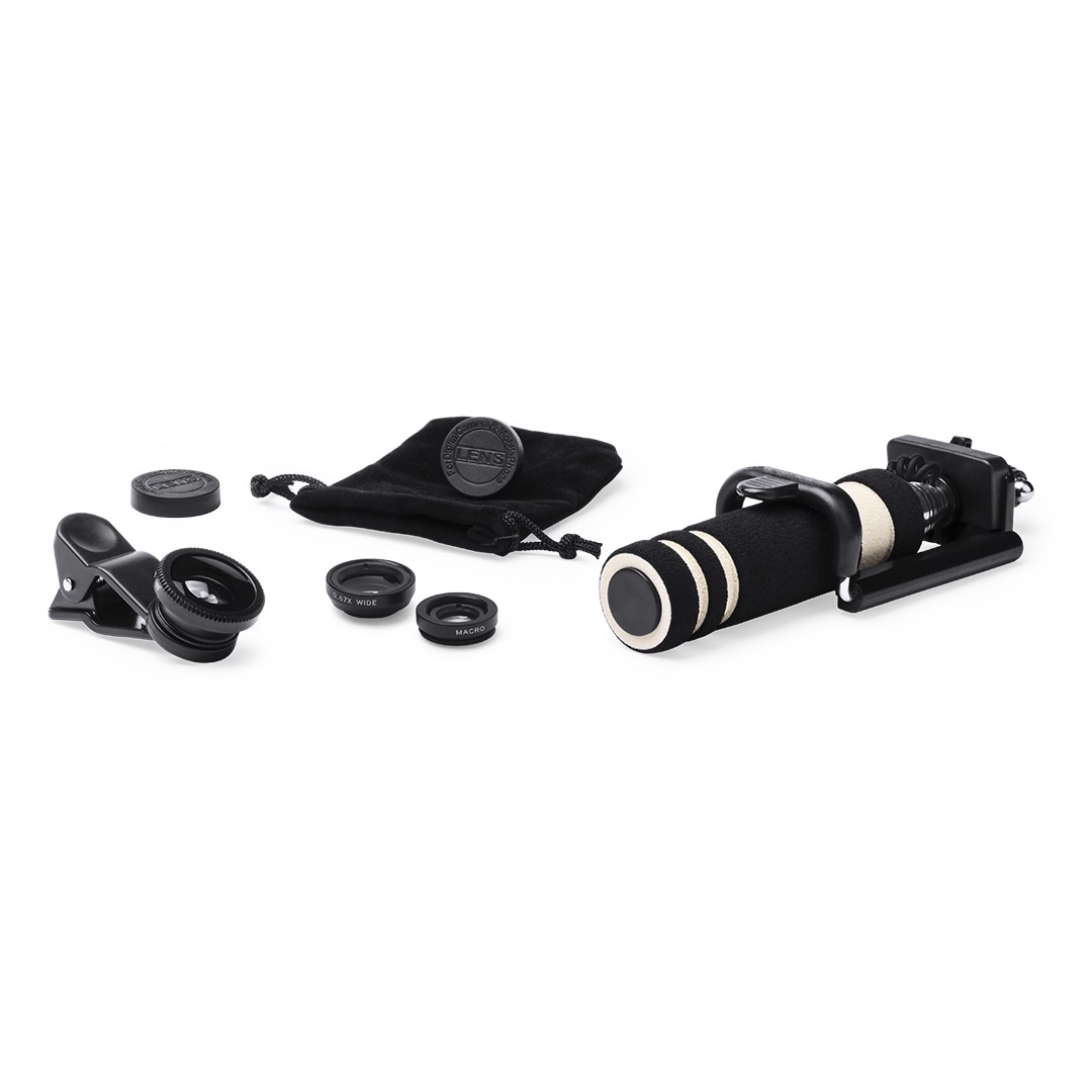 Selfie stick set with effect lenses. Including a folding monopod of minimalist design, with 3.5mm jack connection, anti-rotation system and built-in shooter in the handle. With stainless steel pole and system of pads in the bracket to offer an optimal adjustment and protection of the smartphone. Adjustment nut to fix according to the desired shooting angle, to make selfies even more varied and fun. Compatible with all types of smartphones and especially designed for laser printing and matching color accessories. Includes 3 lenses in aluminum and glass, with -fisheye-, -macro- and -wide angle- effects. Including a microfibre cleaning cloth and presented in a velvet pouch with self-closing laces. Set presented in an attractive design box. 3,5 mm Jack Socket. 7 Positions. 3 Glass Lenses/ Aluminium
