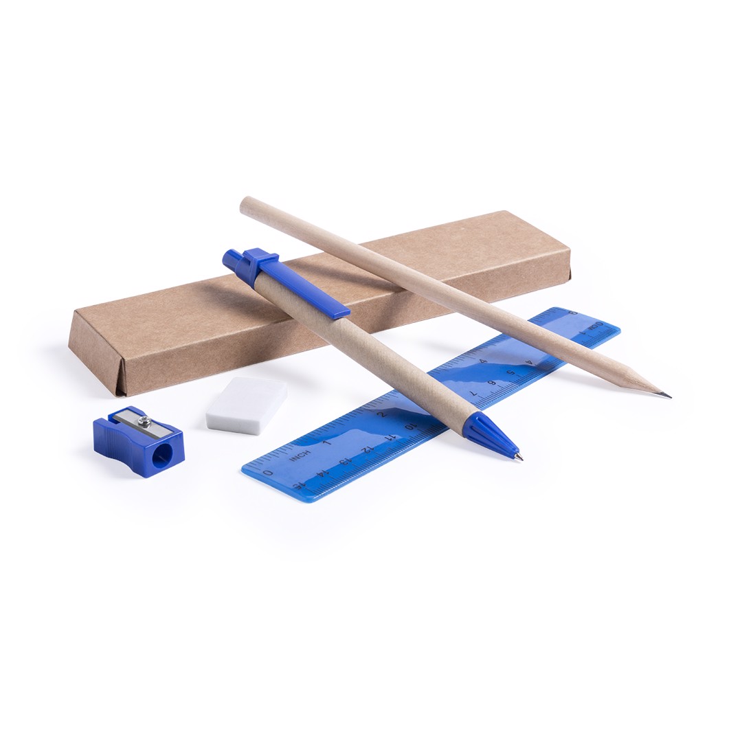 Set of 5 pieces in a varied range of bright tones presented in natural cardboard box. Includes push-up mechanism ball pen and blue ink in recycled cardboard, wooden cylindrical body pencil, pencil sharpener, rubber and 15cm ruler. 5 Pieces