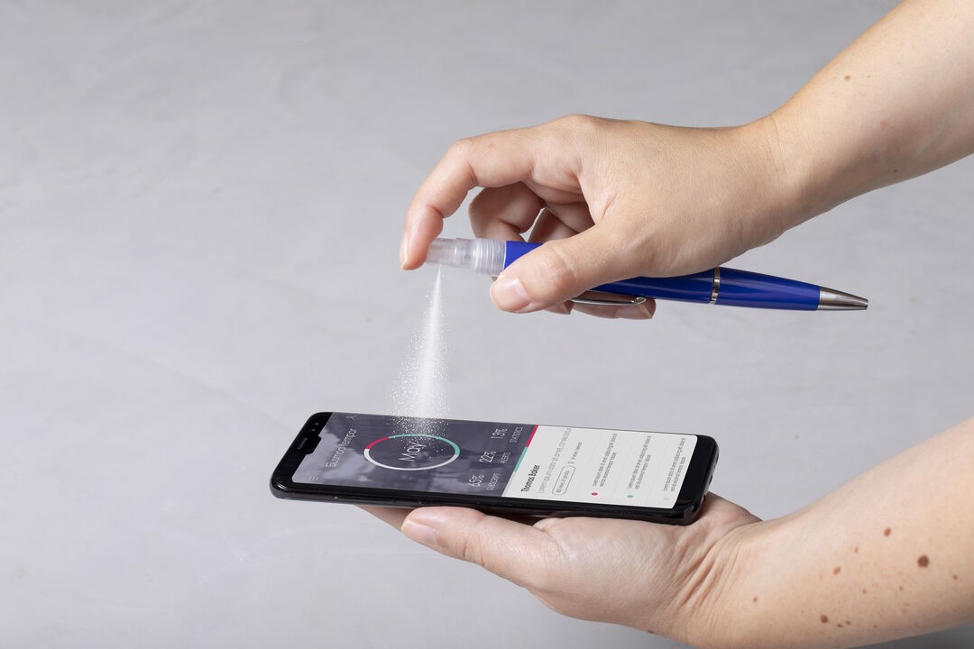 Sterilizer pen with rechargeable sprayer and protective hood. Made of resistant ABS with shiny finish. Elegant metal clip and comfortable handle. Blue ink. Sprayer capacity 3 ml. Liquid not included. Available in a wide range of colours. 3 ml. Liquid Not Included