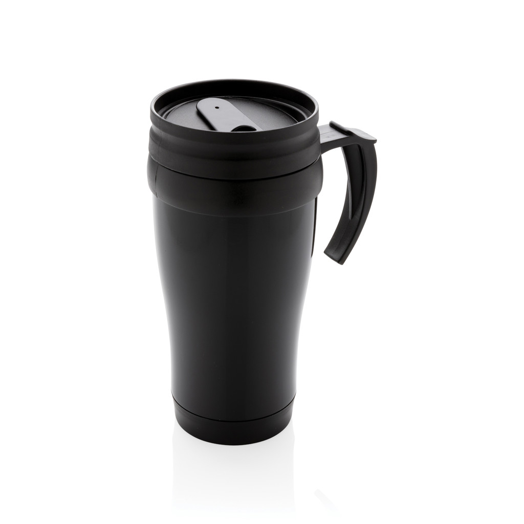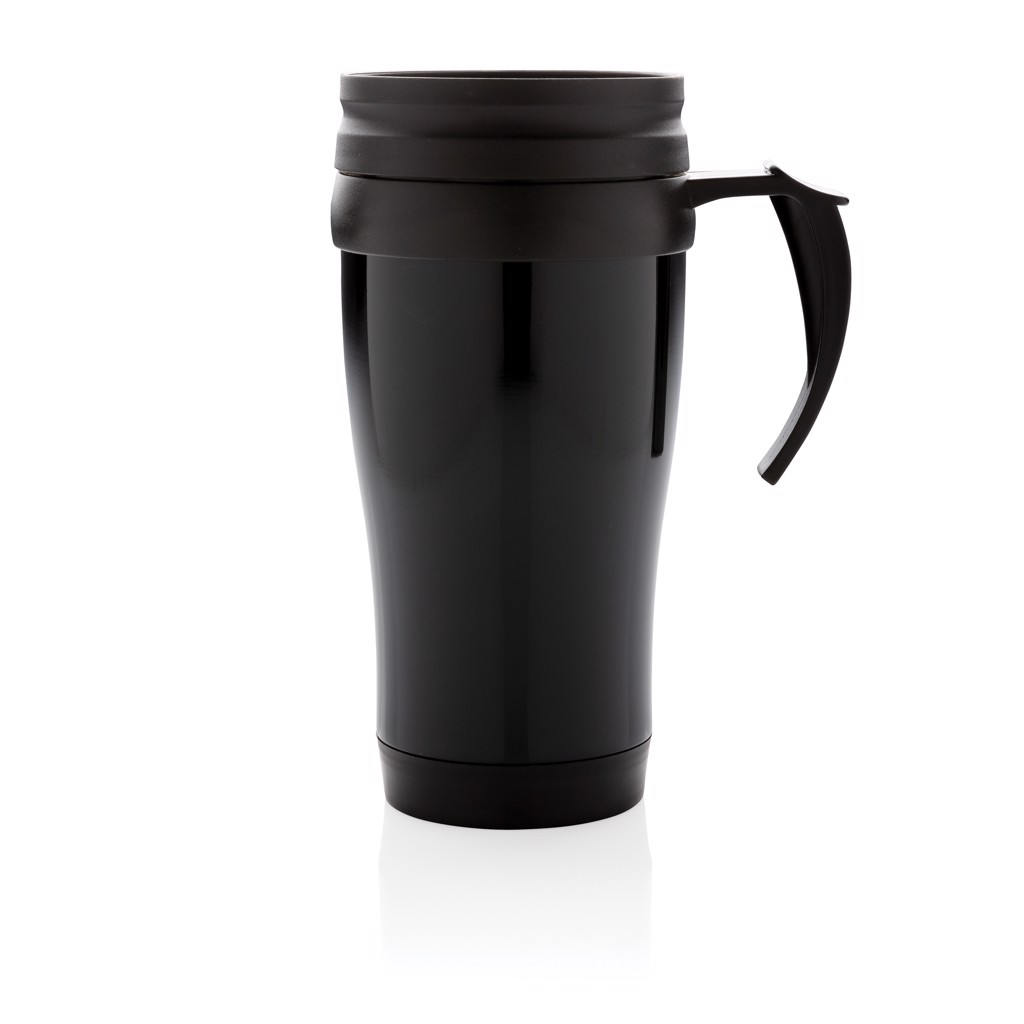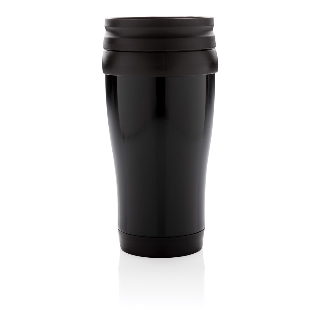 350ml stainless steel outside and PP inside mug with lid and base in black.
