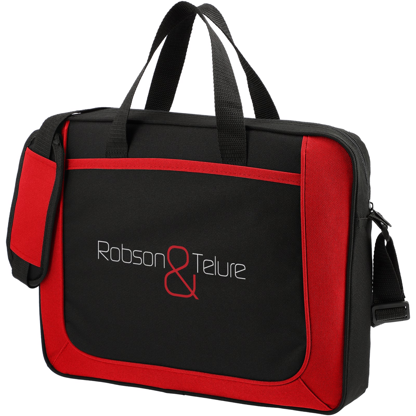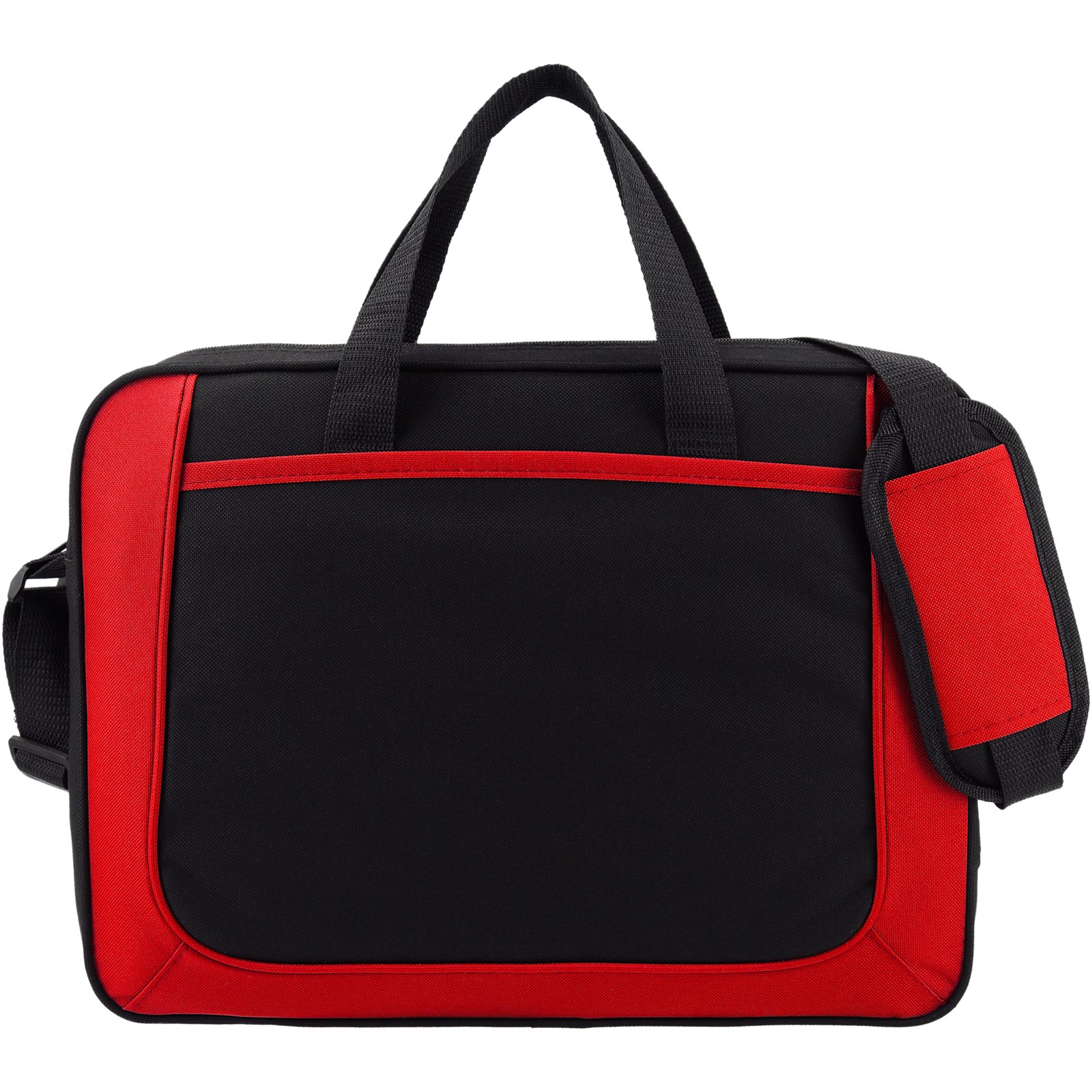 Zippered main compartment with double reinforced top carry handles. Open front pocket. Side accessory pockets and pen sleeves. Adjustable padded shoulder strap.
