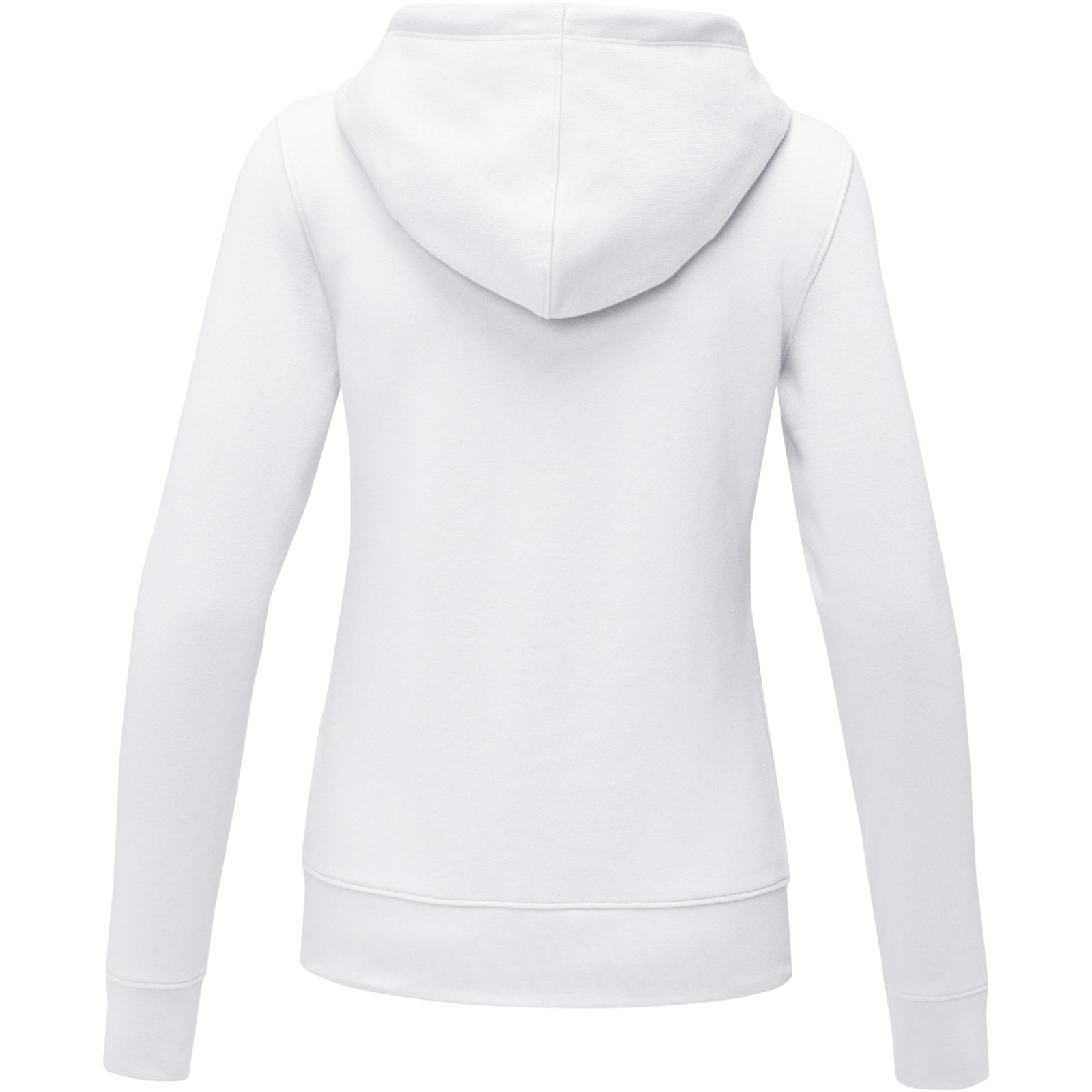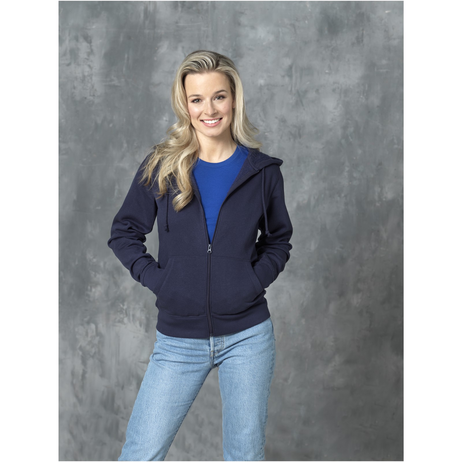 The Theron women's full zip hoodie – where style meets comfort in perfect harmony. This hoodie is a true embodiment of classic design. Additionally, the interior custom branding options allow personalised branding or customisation inside the hoodie. A kangaroo pocket combines convenience with a modern aesthetic. The flat knit rib bottom hem and cuffs guarantee a secure fit, while the brushed interior maximizes softness. The 240 g/m² fabric, blend of cotton and polyester, promises warmth and durability. Elevate your wardrobe with the Theron full zip hoodie. This hoodie is designed with a fitted shape for a feminine look.