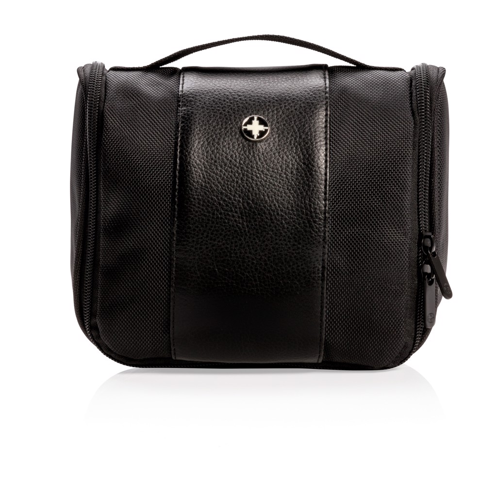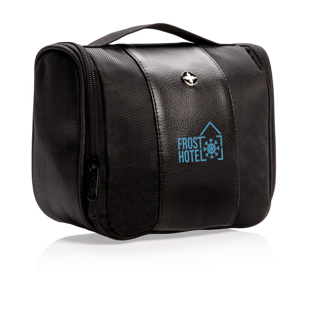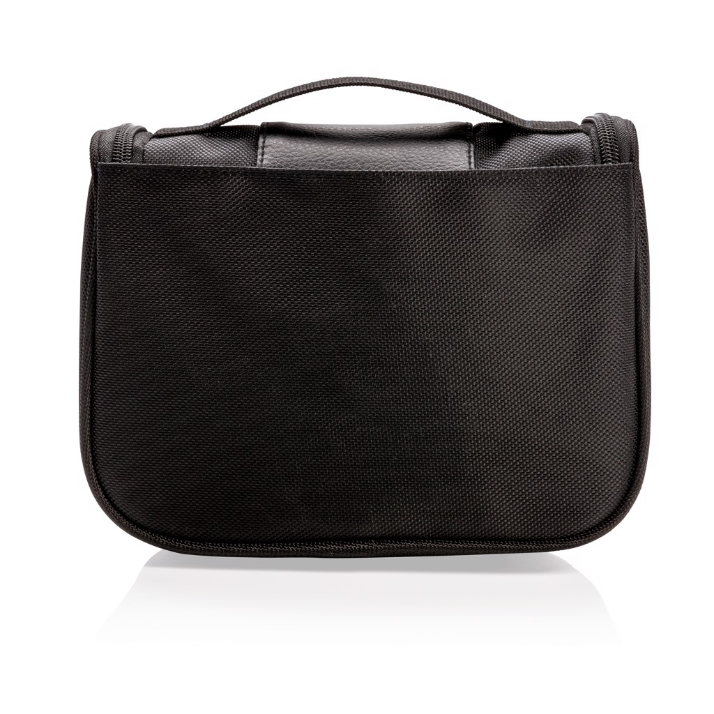 1680D polyester toiletry bag with one main compartment and 4 subcompartments + 2 mesh open pocket 1 mesh zipper pocket inside. Including hook to hang your toilet bag in convenient places.