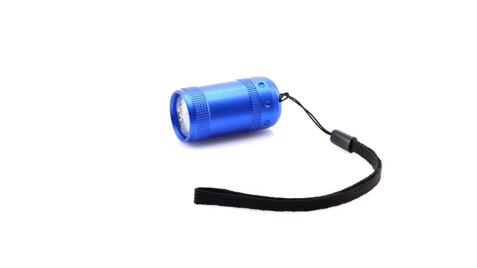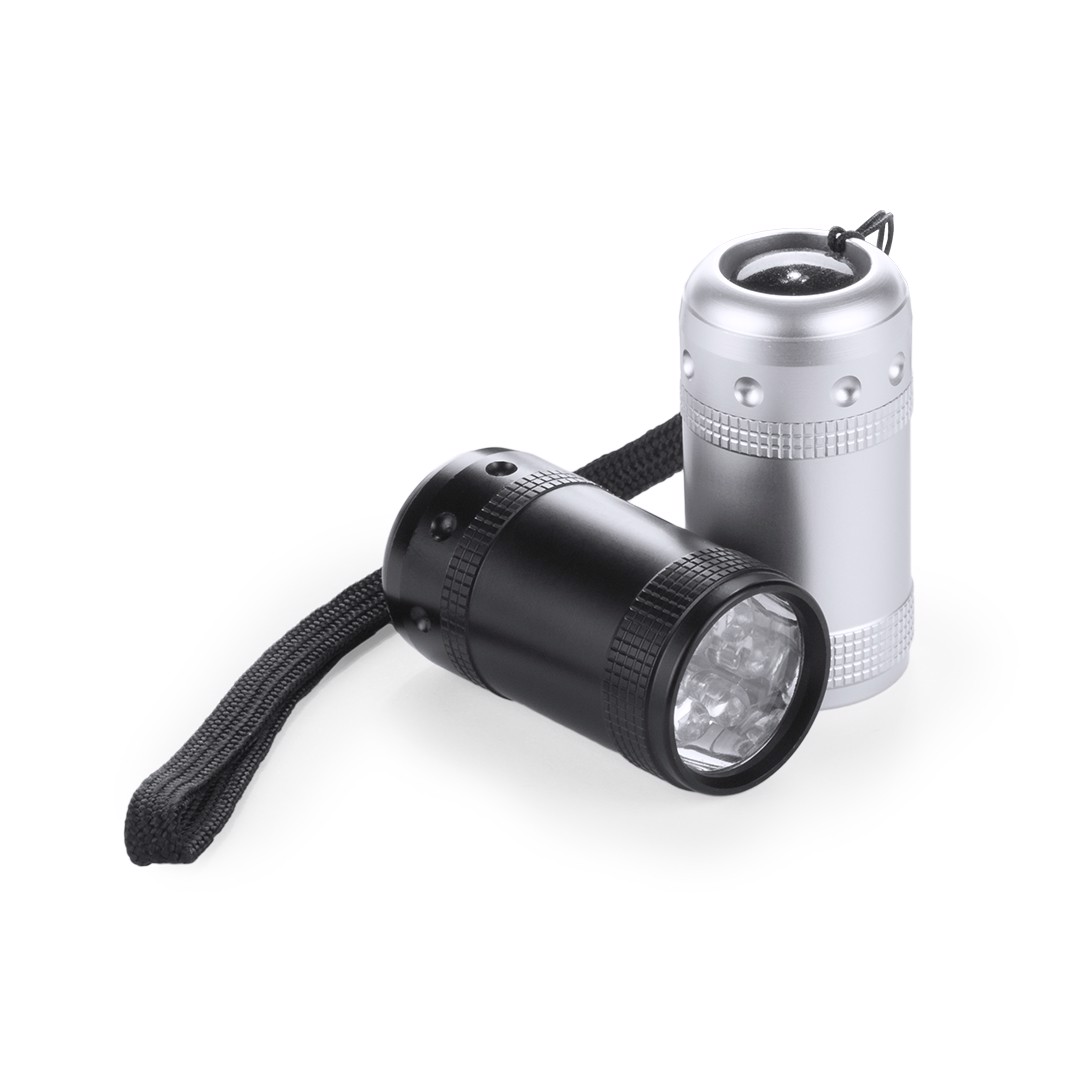 6 LED flashlight with high lighting power and minimalist design. Resistant non-slip aluminum body in varied bright tones, push-up protected with resistant rubber coating and carrying strap. Button cell batteries included with protective film and presented in an individual box. 6 Leds. Button Batteries Included