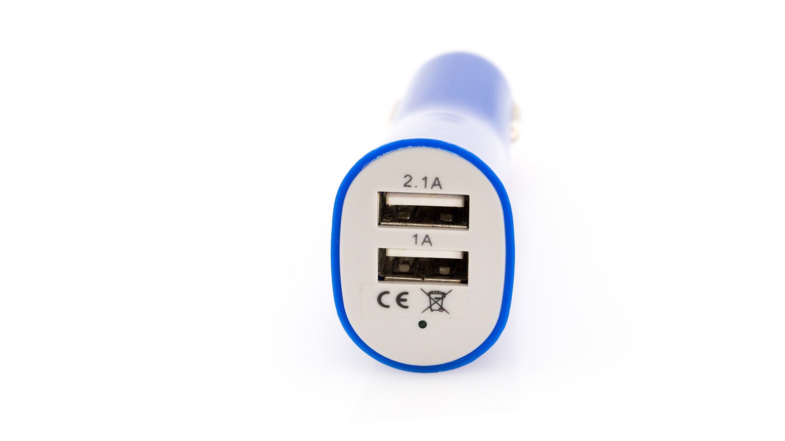 USB charger for car lighter. 2,100 mA charging capacity in bold bicolor design. With dual USB output which allows simultaneous charging of two mobile devices. Translucent cover with LED indicator and presented in an individual box. 2 USB Outputs. 2100 mA