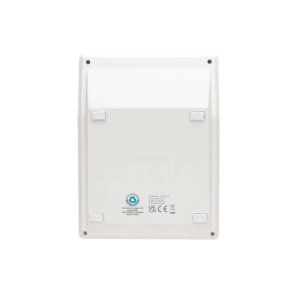 8 digit calculator made with RCS (Recycled Claim Standard) certified recycled ABS and FSC® 100% bamboo. Total recycled content: 70 % based on total item weight. RCS certification ensures a completely certified supply chain of the recycled materials. With solar for re-charging and cell batteries for direct use.