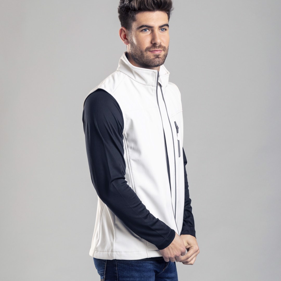 Waterproof and breathable vest in soft shell 300g/m2. In an elegant two color design, with body in white color and details in grey. Zipper closure and front and side zipper pockets. Available in sizes S, M, L, XL, XXL. Wind and Water Resistant. Sizes: S, M, L, XL, XXL