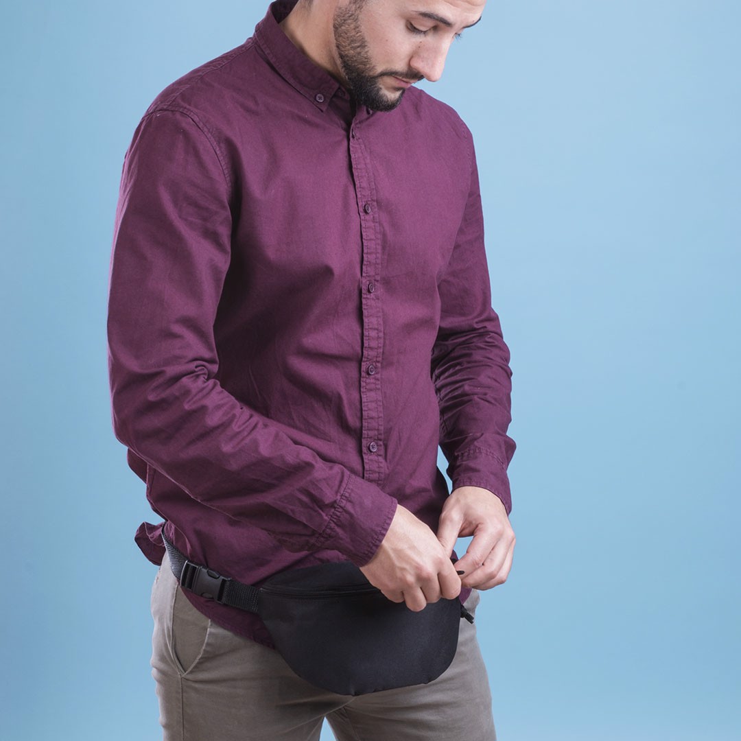 Resistant 600D polyester waist bag with a smart design. In varied colors, with two matching color zipper pockets and adjustable buckle closure waist. Designed for daily and leisure activities.