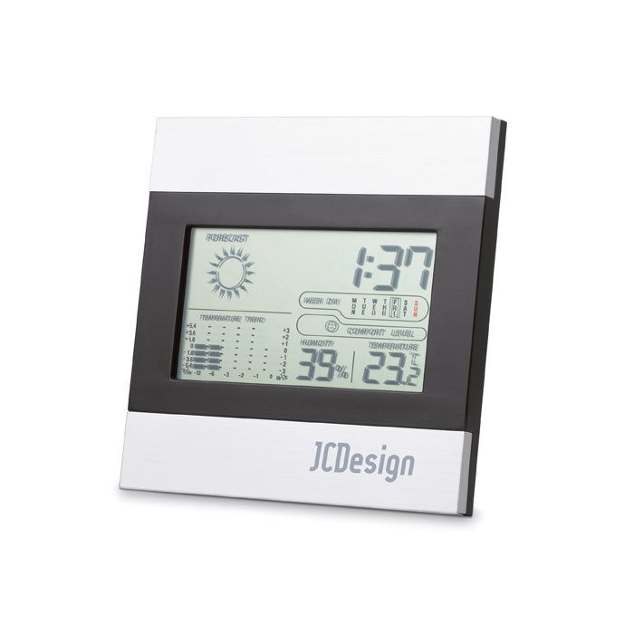 Black and silver weather station. Includes a clock, temperature humidity display and calendar. 2 AAA batteries not included.