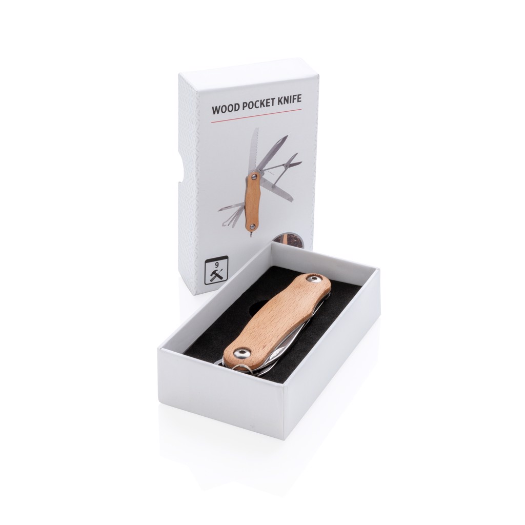 Compact and strong pocket knife with 9 functions. With beech wood case and high quality stainless steel tools. Tools include: knife, serrated cutter, scissors, file, saw, sewing tool, hook disgorger, phillips screwdriver, flat screwdriver. Packed in gift box.